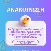 Ανακοίνωση – Κλειστά τα γραφεία του ΚΣ την Τρίτη 02/12/2025